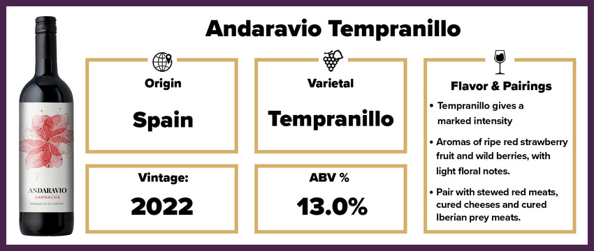 Andoravio Tempranillo, hailing from the renowned Castilla de Mancha region of Spain, boasts a bold intensity that highlights its distinctive varietal characteristics. This oaked Tempranillo exudes enticing aromas of ripe red strawberry fruit interwoven with wild berries, heightened by delicate floral undertones.