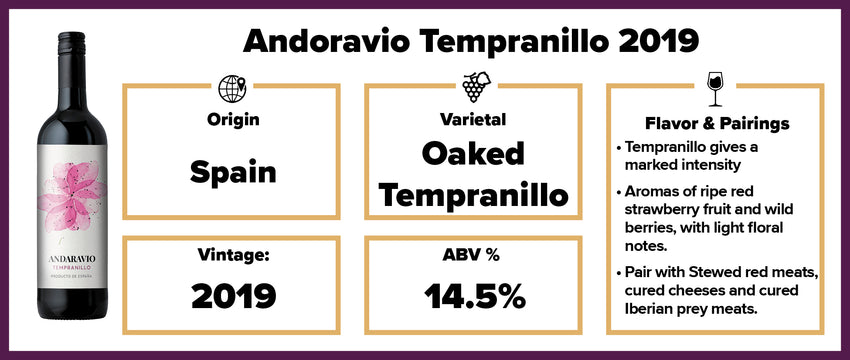 Andoravio Tempranillo is grown in the Castilla de Mancha region of Spain which gives the grapes a marked intensity in which its varietal characteristics standout. Aromas of ripe red strawberry fruit and wild berries mingle with light floral notes. We recommend serving with stewed or braised red meats or cured cheeses.