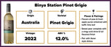 Binya Station Pinot Grigio originates from Australia, showcasing a refreshing character with distinct notes of citrus, tangy grapefruit, and fresh green apple. Its palate leans towards dryness, presenting an initial tartness that finds equilibrium with subtle sweetness and delicate peach undertones. Accompanied by hints of minerality and grass, this vibrant wine offers complexity and depth.