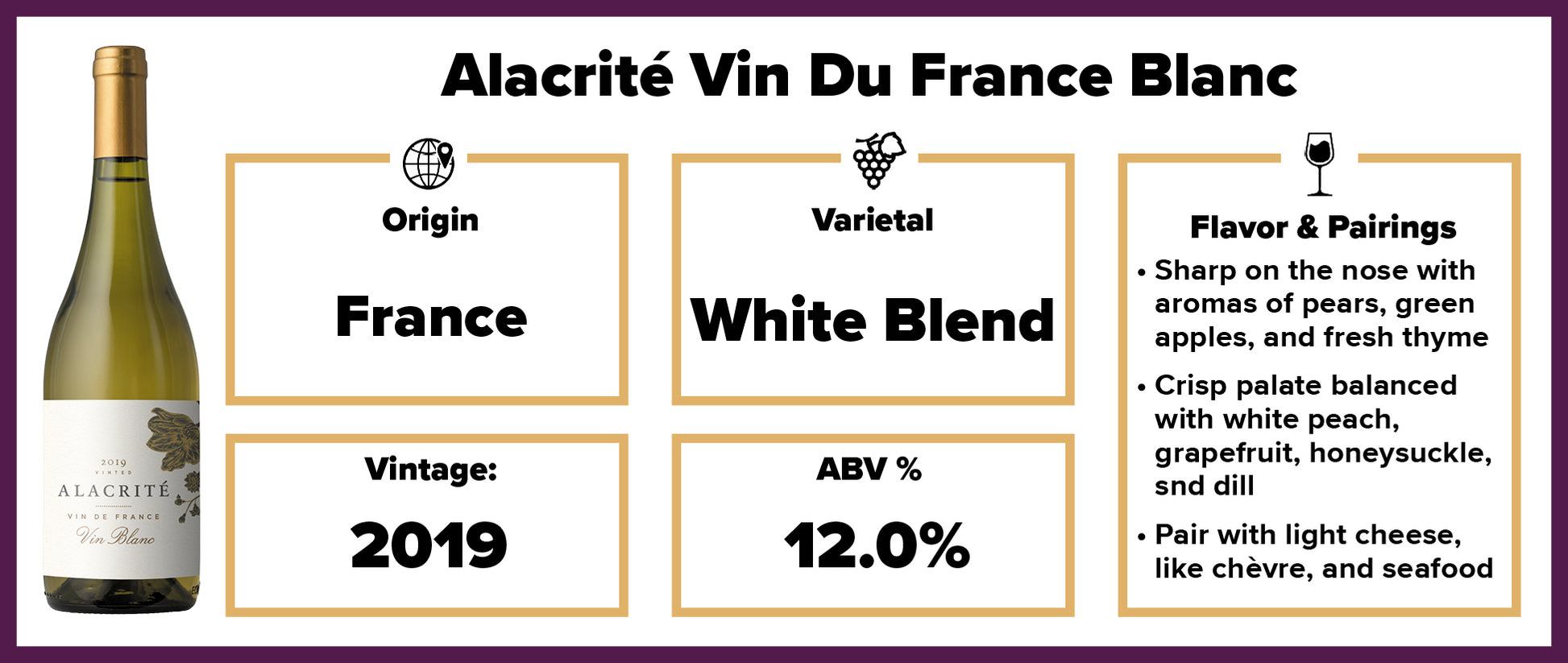 With balanced acidity and fruit, this tart varietal is perfect for Summer. Hailing from southern France, the vineyards that grow the grapes for Alacrite are greatly influenced by the Mediterranean weather and benefit when paired with fresh food from the sea. It is said that the grapevines in this ancient land existed before people. This ideal growing region brings warm days, cool nights, adequate water, and bountiful land with a wide range of soil from rocky sand to thick clay. Almost 10% of the world’s wine was produced in this region during the 20th century.