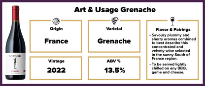 Introducing the 2022 Art & Usage Grenache from France's charming Pays d'Oc region—a bottle brimming with adventure in every sip. Sourced from the sunny vineyards of Languedoc-Roussillon, this Grenache is your ticket to southern French charm. Envision wandering through a bustling French market, where ripe red berries, hints of lavender, and spices tantalize your senses. Cherries and raspberries take the spotlight in this red fruit symphony. Pair it with your favorite dish, whether dining with friends or enjoying a solo moment with a good book. More than just a wine, the 2022 Art & Usage Grenache is a companion for those who cherish life's simple pleasures, infused with French flair.