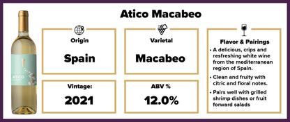 Atico is an award-winning winery and this Macabeo is another star in their collection. While Macabeo isn’t particularly well-known in the US, it is the second most widely planted grape in Spain. Macabeo drinks similarly to a Sauvignon Blanc- on the drier side with excellent acidity and balanced by fruity notes. Atico presents with notes of flowers and fresh-cut grass, balanced with classic citrus lime and passion fruit.