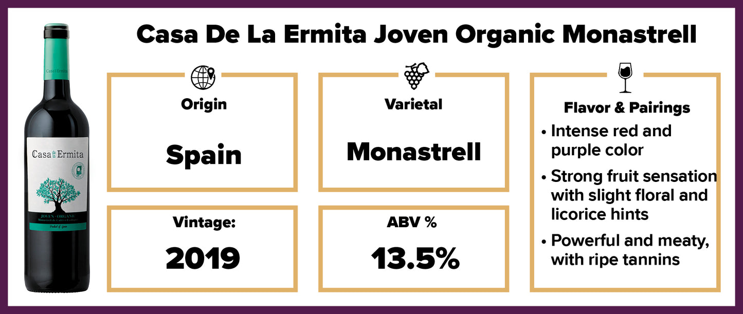 Casa de la Ermita Joven is an organic, 100% Monastrell from the Jumilla region (a small growing region specializing in Monastrell on the southeastern, Mediterranean coast of Spain). Garnet in color with dark violet edges, the nose is filled with fruity florals and licorice notes. Mature tannins with aromatic balsamic aromas and a spicy peppery finish. We recommend pairing with spicy red meat dishes, pasta with tomato sauce, sausages, and hearty roasts.