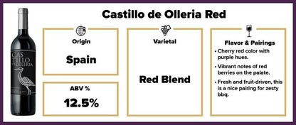 Crafted in the heart of Valencia, Spain, Castillo de Olleria red is a radiant cherry red wine with alluring violet hues that captivate the eye. Echoing the vibrancy of its Mediterranean origins, this wine embodies the essence of Spanish winemaking tradition. Its aroma evokes a basket of freshly picked ripe red berries, offering an intense and inviting bouquet. Upon tasting, the palate is greeted with a refreshing burst of fruit flavors, complemented by a lively acidity that dances on the tongue. The finish is persistent and satisfying, leaving a lingering impression of its vibrant character.