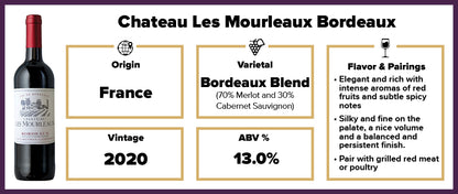 The 2020 Château Les Mourleaux Bordeaux tantalizes the taste buds with flavors that mirror its distinctive terroir and velvety texture. Envision the luxurious aroma of ripe blackberries intertwined with a hint of cedar, as if the vineyards are divulging their secrets with a touch of vanilla. Visualize the indulgent taste of dark cherries entwined with delicate notes of tobacco, crafting a harmonious symphony that lingers on your palate.