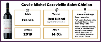 Pair the Michel Cazevieille Saint Chinian 2019 with hearty dishes like lamb stew, beef bourguignon, or grilled ribeye. Its full-bodied, velvety texture complements the rich flavors of these meats.