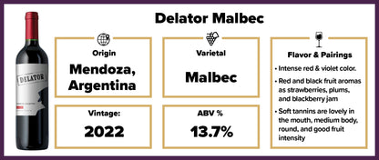 Delator Malbec 2022 has an intense red and violet color. There is a nice combination of red and black fruit aromas as strawberries, plums, and blackberry jam. It`s sweet and soft tannins are lovely in the mouth, medium body, round, and good fruit intensity.