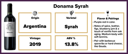 Donama Syrah comes from Argentina and is a gorgeous, deep purple red color. Syrah is a thick-skinned grape that originates in the Rhone Valley, but has been successfully grown in warm climates, like Argentina, for many years. Usually used a blending juice in Argentina, a pure Syrah from Argentina is relatively rare (though growing in popularity). Donama has notes of spice, leather, figs, blueberries and a touch of vanilla from oak aging. The body is medium-full with balanced acidity and soft tannins. We recommend pairing with barbeque spareribs or hard cheeses.