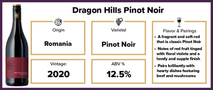 Dragon Hills Pinot Noir has a lovely light, red-fruited nose that is really rather pretty with notes of floral violet. There are gentle supporting woody notes from a little time in oak and a delightfully soft, supple finish. Chilled a few degrees, this would be a stunning wine with crispy duck, lamb curries and chili beef.
