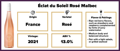 On the palate, the Éclat du Soleil Rosé Malbec unfolds with a delightful array of flavors. Ripe red berry flavors, such as strawberry and raspberry, take center stage, complemented by hints of juicy watermelon and a touch of crushed herbs. The wine's crisp acidity provides a refreshing and lively mouthfeel, while its medium body and balanced structure offer a smooth and satisfying finish. This rosé is a versatile choice for various occasions, pairing beautifully with light salads, grilled seafood, or simply enjoyed on its own as a refreshing aperitif. The Éclat du Soleil Rosé Malbec 2021 encapsulates the essence of summer with its vibrant flavors and refined character, making it a delightful companion for warm days and relaxed gatherings.