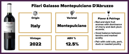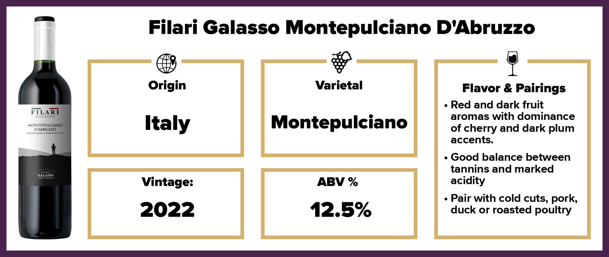 Wine from the Montepulciano variety, grown in the vineyards of sunny Abruzzo.
