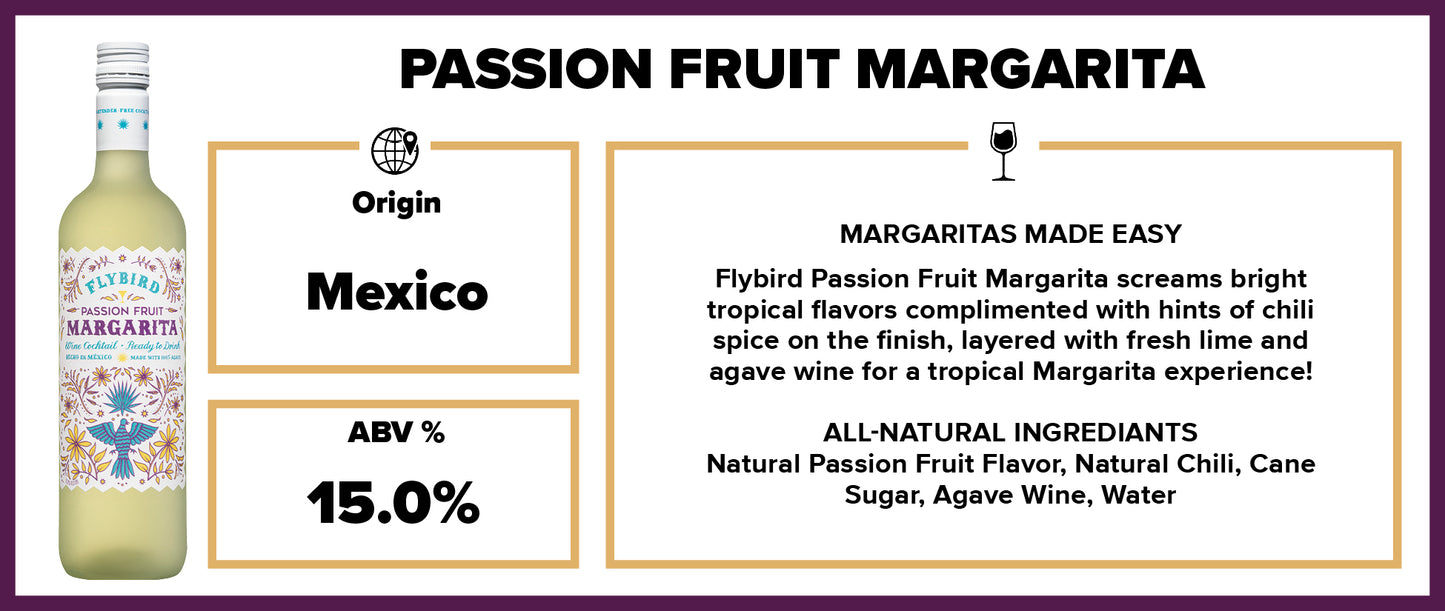 Flybird Passion Fruit Margarita screams bright tropical flavors complimented with hints of chili spice on the finish, layered with fresh lime and agave wine for a tropical Margarita experience!