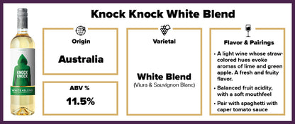 Knock Knock Viura/Sauvignon Blanc presents a delightful fusion of Viura and Sauvignon Blanc, offering a unique and refreshing experience. Viura, a traditional Spanish grape, combines harmoniously with Sauvignon Blanc to create a wine that is both vibrant and expressive. With its pale straw color, this blend entices with aromas of citrus, green apple, and tropical fruits, while a hint of herbal freshness adds complexity. On the palate, crisp acidity intertwines with flavors of lemon, grapefruit, and a touch of peach, culminating in a clean and zesty finish.