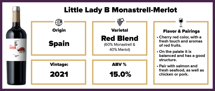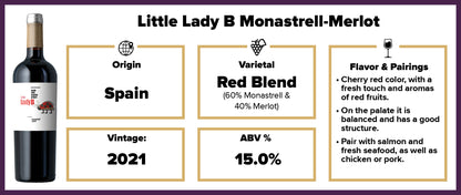 Little Lady B Monastrell-Merlot blend is made of 60% Monastrell and 40% Merlot crafted in the Murcia region of Spain, known as the home of Monastrell. Spanish Monastrell is crafted with Mourvedre grapes (the second most popular grapes in Spain after Tempranillo), which impart complex flavors of dark fruits, like cherries, blueberries and a bit of plum, balanced with earthy notes like leather, vanilla and licorice. Brighter fruit notes are imparted by the Merlot blend. The palate is bursting with notes of cherries, both dried red cherries and fresh black cherries. The wine is fruit-forward with a balanced palate and good structure. We recommend pairing with non-white fish, like salmon or roasted chicken and pork.