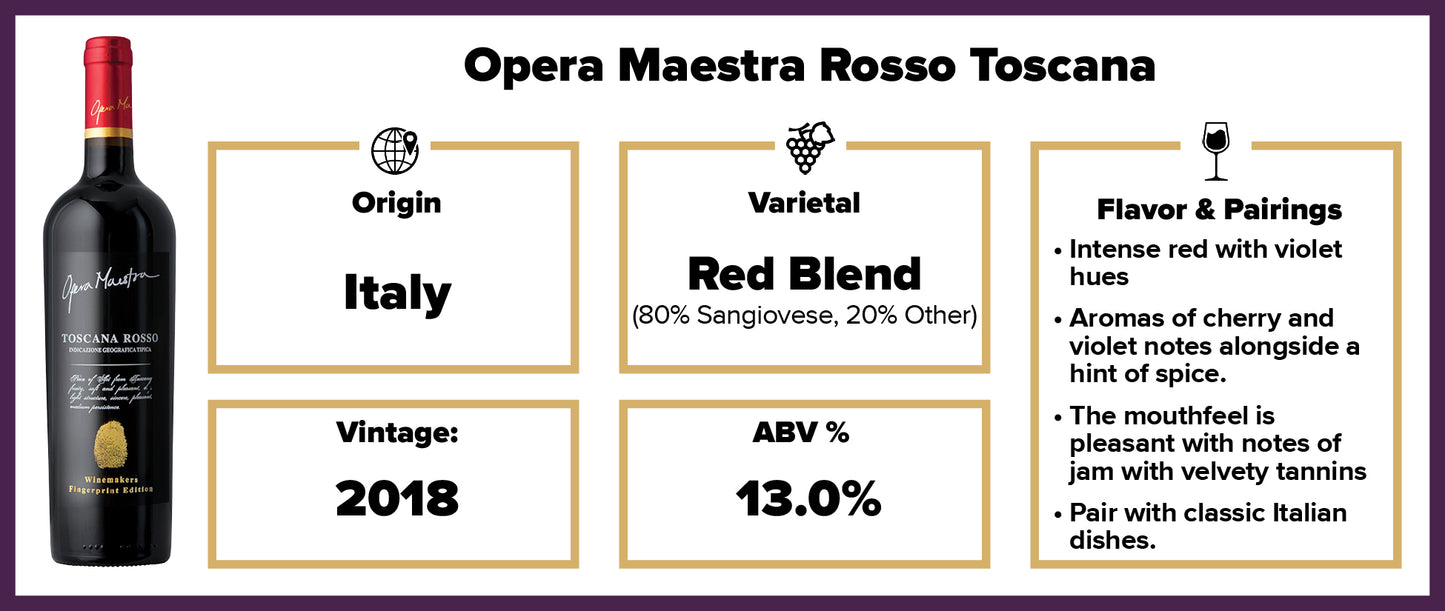 Opera Maestra Rosso Toscana is grown and crafted in rolling hills of Tuscany and consists of 80% Sangiovese and 20% complementary native grapes. The grapes are harvested separately, then vinified in the traditional manner using selected yeasts at a controlled temperature of 23°C in stainless steel tanks, in contact with the skins for 10 days with manual pumping over. The wine is then further aged in cement tanks until it is fully ripe before further refining in the bottle for another 2 months. The resulting wine is an intense red with violet hues with aromas of cherry and violet notes alongside a hint of spice. The mouthfeel is pleasant with notes of jam with velvety tannins combined with a pleasant sapidity. Tuscany is known for “Super Tuscan” Red wines that pair beautifully with classically Italian dishes. We recommend pairing with herbaceous, spicy red meat sauces poured over fresh pasta.