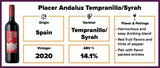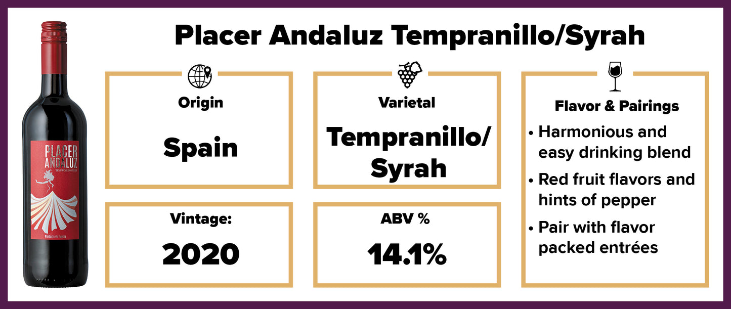 Combining Tempranillo, Spain's signature grape, with Syrah, more commonly associated with France, particularly the Rhone region, the Placer Andaluz Tempranillo-Syrah offers a unique and intriguing blend. Upon tasting, we were pleasantly surprised by its youthful vibrancy and depth of flavor, with the Tempranillo contributing bold fruitiness and the Syrah adding elegance and structure, along with subtle hints of spice. This graceful wine, reminiscent of the dancer depicted on its label, presents a harmonious fusion of red fruits and peppery spice on the palate.