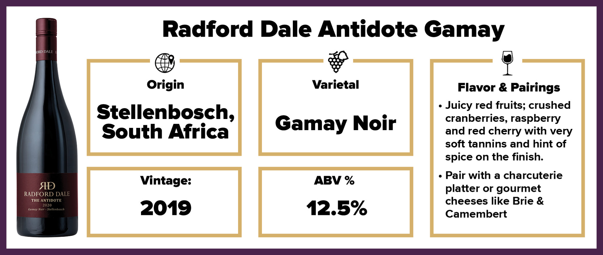 Radford Dale “The Antidote” is made from grapes from a single 20-year-old vineyard on their South African vineyard. Because of a cold, dry season, fewer grapes were able to be harvested, but the grapes that were harvested were more intensely flavored than years past. The nose has a full and generous bouquet, with lots of lush plum and raspberry and complex aromas of spice and herbs. This Gamay is intensely fruity and complimented by airy and supple tannins. Just enough grip to define the finish. One of a kind, totally individual.
