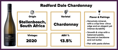 Unlike typical California Chardonnays, the Radford Dale edition forgoes buttery and oaky flavors, offering instead a well-structured wine with austere elegance. Perfectly suited for fish entrees, it also serves as a refreshing sipper on a temperate evening on the patio.