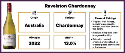 On the palate, the Ravelston Chardonnay unveils a captivating blend of flavors. Luscious tropical fruit flavors, including pineapple, mango, and ripe pear, take center stage, complemented by hints of toasted almond and a subtle touch of butter.