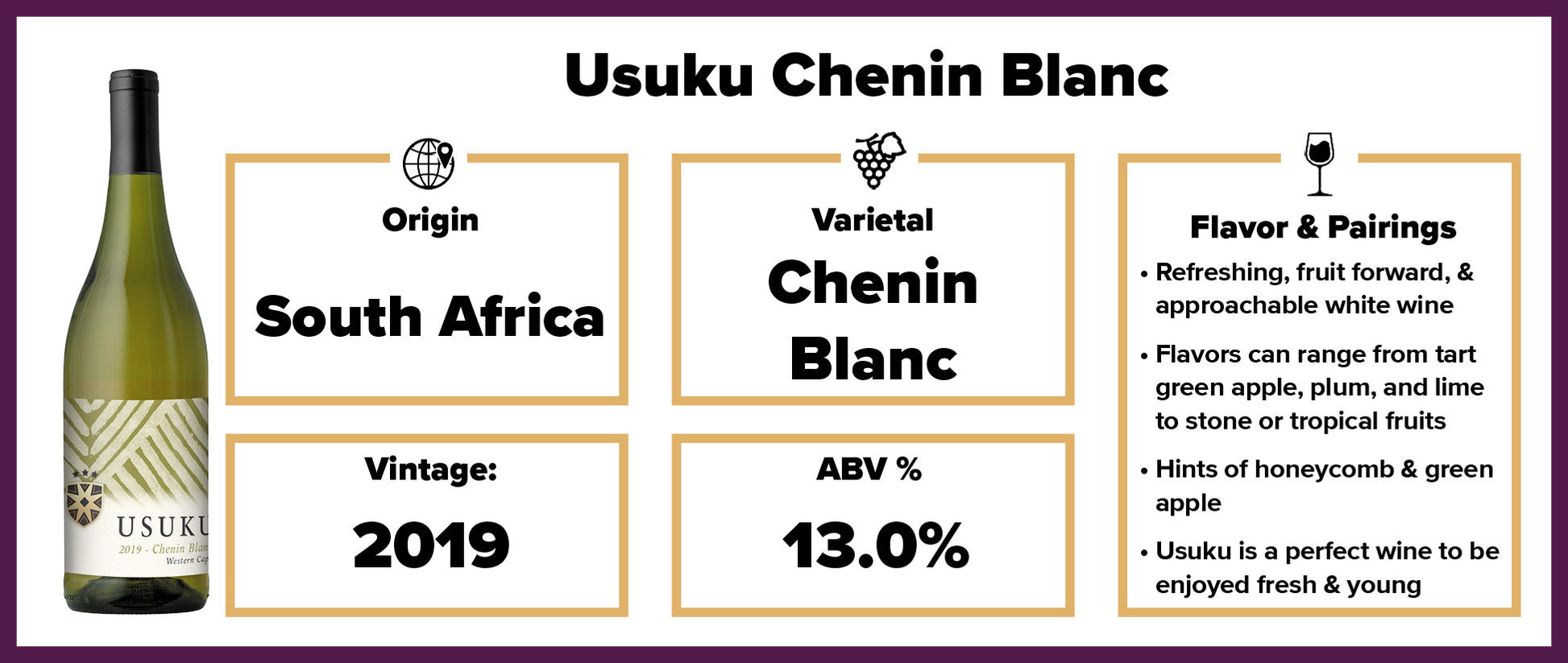 Usuku is a refreshing, dry, and crisp wine from the Western Cape. Made of only Chenin Blanc, it has hints of honeycomb and green apple and is a perfect wine to be enjoyed fresh and young.