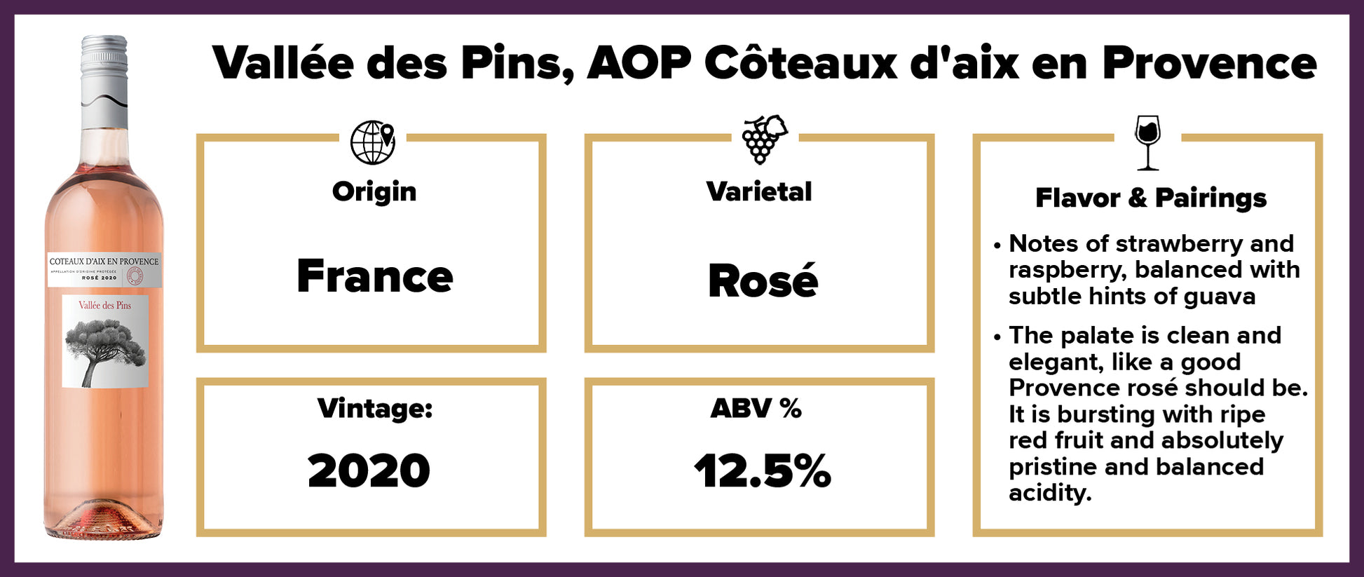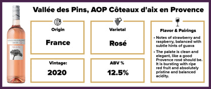 Vallée des Pins, AOP Côteaux d'Aix en Provence, from Provence, France, is a crisp and dry rose that enchants with intense flavors of strawberry, raspberry, and hints of guava. Its refreshing palate showcases ripe red fruits and perfectly balanced acidity, making it a versatile companion for salads, roasts, sushi, and fish dishes. With its vibrant fruitiness and clean finish, this delightful rose elevates the flavors of any meal.