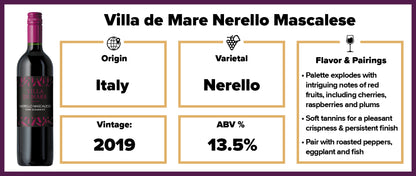 Villa di Mare Nerello Mascalese is a beautiful, richly garnet-hued red wine from Italy. The boldness of this wine is not simply reserved for the color, the palette explodes with intriguing notes of red fruits, including cherries, raspberries and plums. These flavors are perfectly harmonized with the soft tannins for a pleasant crispness and persistent finish. The Nerello Mascalese variety is not well known in the United States due to the fact that it grows primarily on the slopes of Mount Etna in Sicily. Despite its rarity, the wine offers amazing value and a taste profile that is often likened to fine Pinot Noir. We recommend pairing with classic Sicilian foods like roasted peppers, eggplant and fish (yes, we totally recommend pairing this red with fish- the balanced tannins pair beautifully with it).
