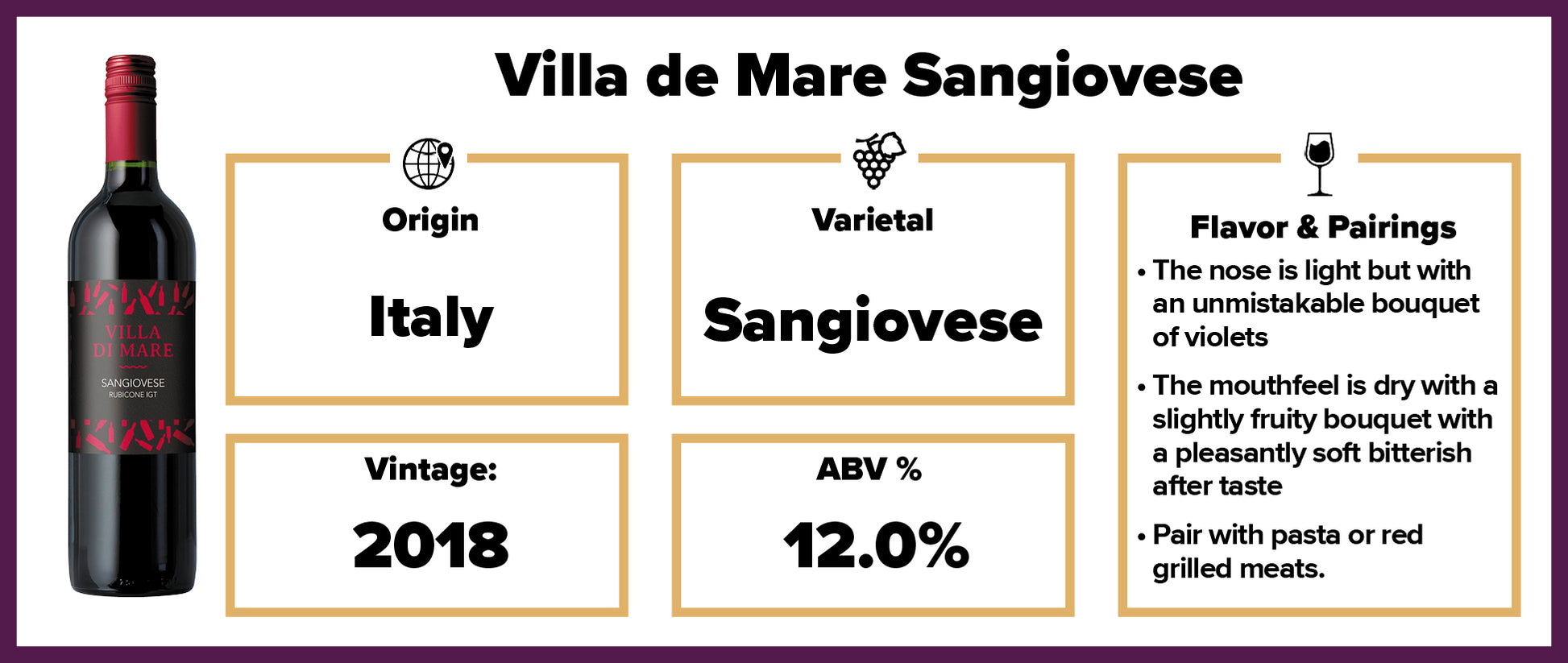 Villa di Mare Sangiovese is grown in the Rubicone Area of the Emilia Romagna Region in Central Italy. Made from the famous Sangiovese grape, this wine is deep red with violaceus reflections. The nose is light but with an unmistakable bouquet of violets. The mouthfeel is dry with a slightly fruity bouquet with a pleasantly soft bitterish after taste. This wine is excellent with tagliatelle, pasta and red grilled meats.