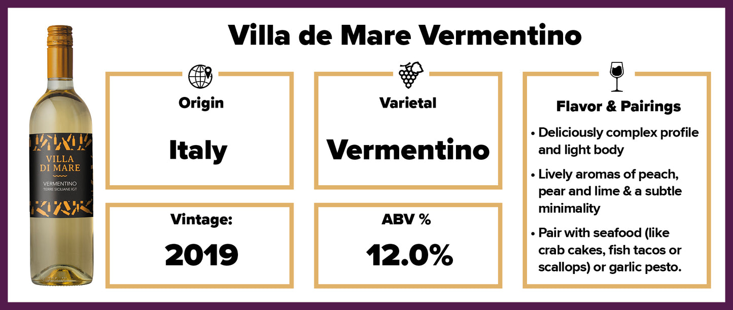 In the United States, Vermentino is a relatively unknown wine varietal. With a deliciously complex profile and light body (think Sauvignon Blanc), because it hasn’t gained traction in the US yet, you can get a great quality of wine at an excellent value. Villa di Mare Vermentino is a classic Sicilian white with lively aromas of peach, pear and lime and a subtle minerality that comes from the soil where it is grown. We recommend pairing with seafood (like crab cakes, fish tacos or scallops) or garlicy pesto.