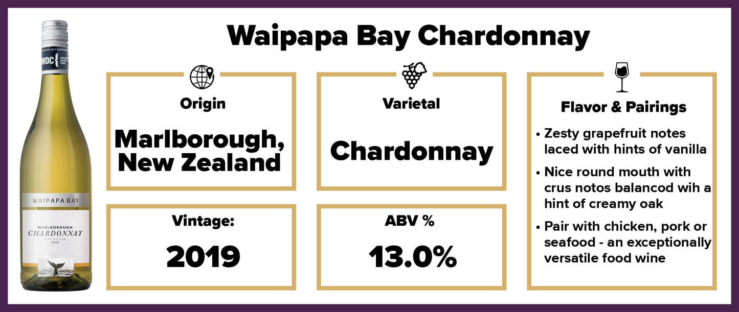 Waipapa Bay is a place of stunning natural beauty - close to the vineyards where the wine is produced. A laid back surf spot beneath the snow-capped Kaikoura Mountains overlooking the Pacific Ocean - where whales are regularly spotted and which inspired the wines label. In tandem with the launch of the 2019 vintage in the USA, Waipapa Bay Wines has partnered with the Whale and Dolphin Conservation (WDC) as the non-profits first wine industry corporate sponsor.